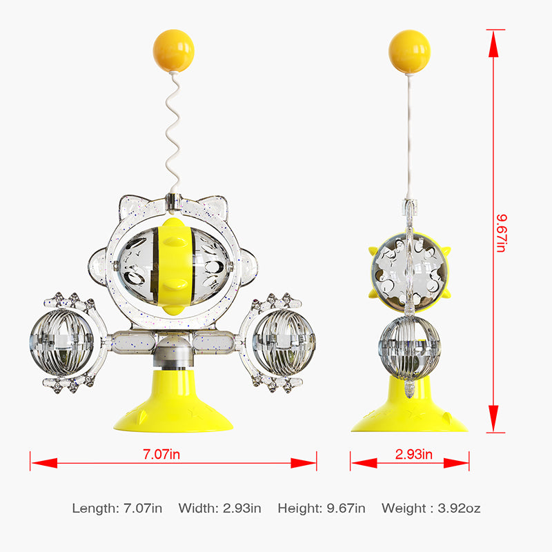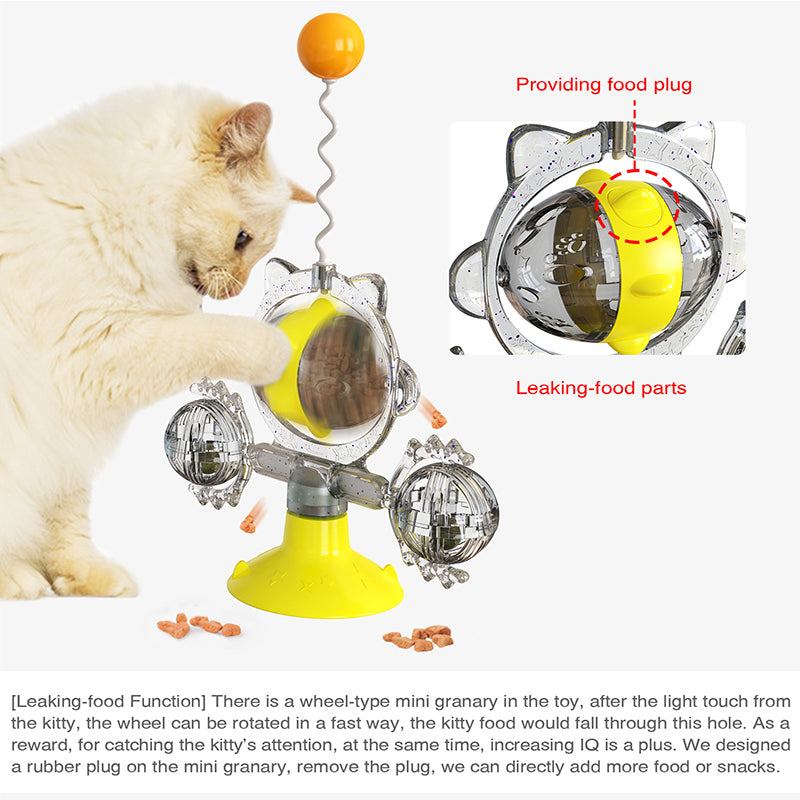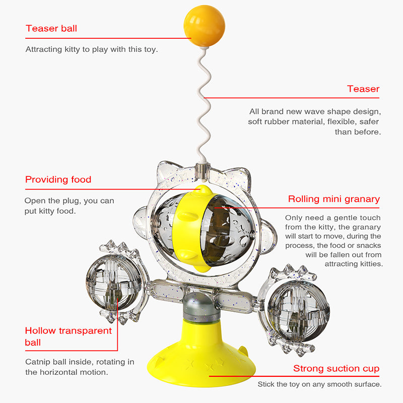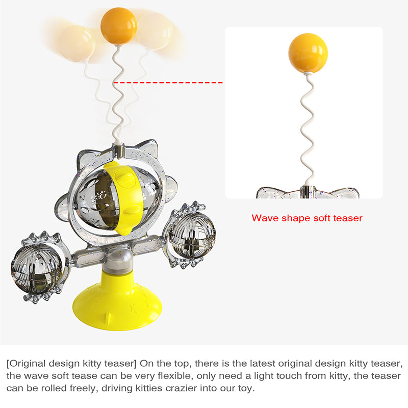 Elevate your cat's playtime with our Catnip Teasing Stick! This windmill turntable toy engages and entices with a sucker for treat leaking. Make learning fun and even facilitate teeth brushing! A perfectly fun and educational addition to your feline's supplies.